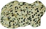 Frog carving in colorful Dalmatian Jasper. Dalmatian Jasper has unusual contrasting brown and black spots amid a creamy matrix. This stone enhances the sense of brotherhood, goodwill and benevolence. The frog was a potent symbol and source of self transformation for Native American Shamans who used their secretions for mystical rituals.