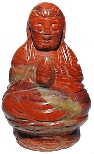 | Auspicious Red Jasper carving of praying Kwan Yin, the oriental Goddess of Compassion. Red Jasper is said to be a stone of justice, assisting to rectify unjust circumstances. It is also thought to be protective. Kwan Yin (also Guan Yin or Quan Yin) means "One who Hears the Cries of the Suffering." |